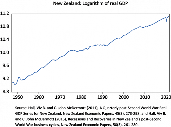 Unfortunately, official New Zealand data on quarterly real Gross Domestic Product (GDP) only goes back to 1987, limiting our ability to understand the nature of growth or the frequency of recessions.